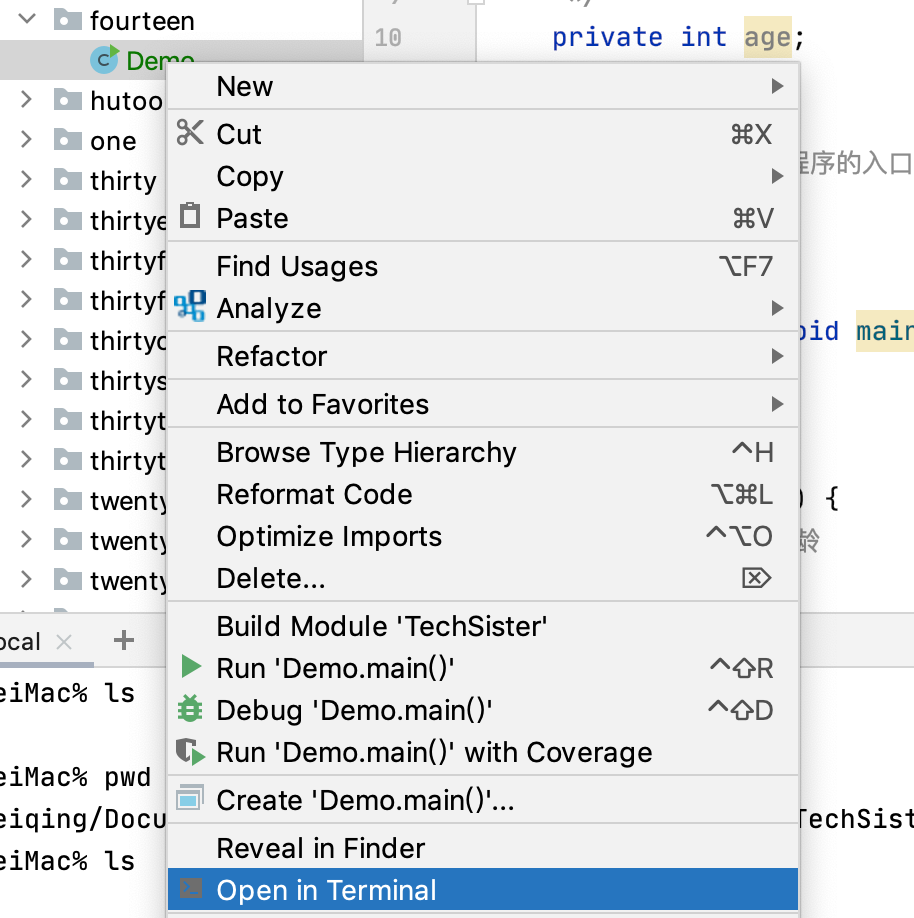 第一步,在该类文件上右键,找到「Open in Terminal」 可以打开命令行窗口。