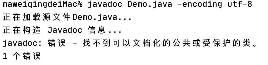 第二步,执行 javadoc 命令 javadoc Demo.java -encoding utf-8。-encoding utf-8 可以保证中文不发生乱码。