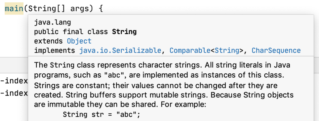 比如说,在使用 String 类的时候,鼠标悬停在 String 上时可以得到以下提示。