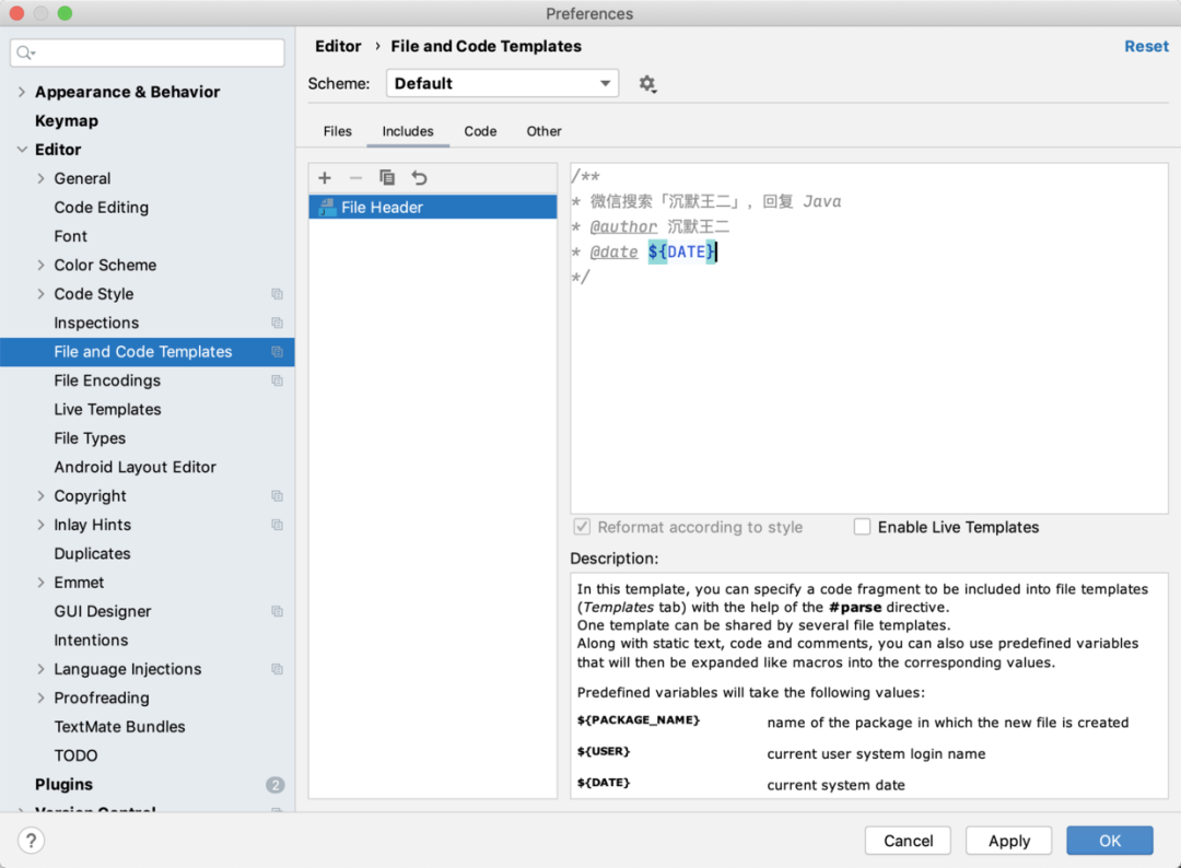 /*** 微信搜索「沉默王二」,回复 Java* @author 沉默王二* @date ${DATE}*/