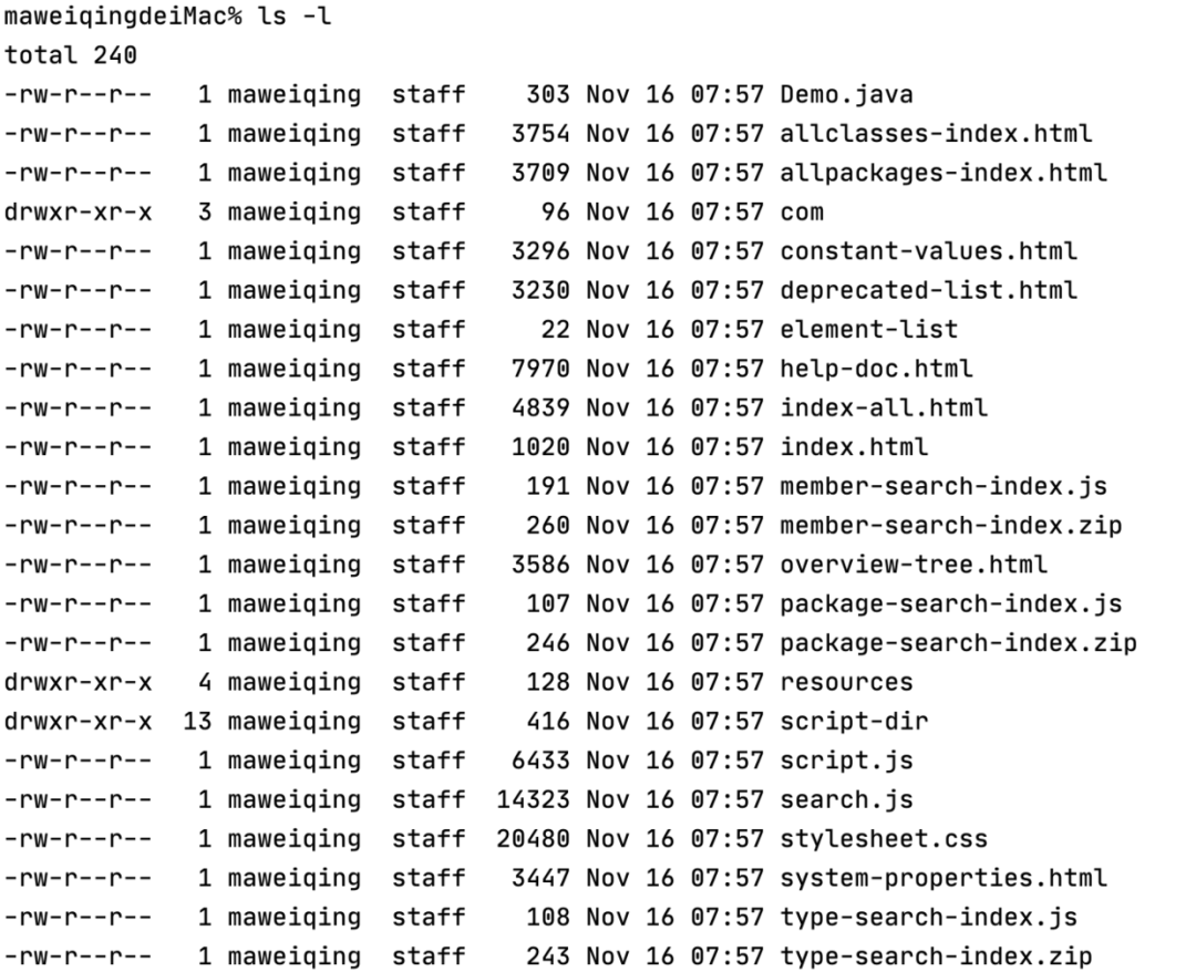 **第三步,**执行 ls -l 命令就可以看到生成代码文档时产生的文件,主要是一些可以组成网页的 html、js 和 css 文件。