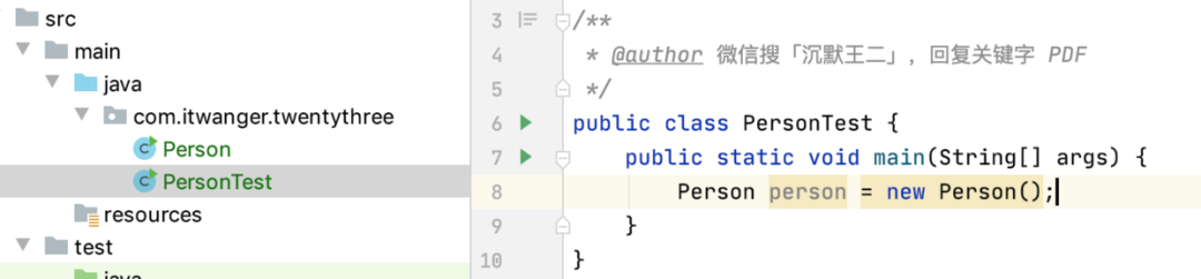 /** * @author 微信搜「沉默王二」,回复关键字 PDF */public class PersonTest { public static void main(String[] args) { Person person = new Person(); }}class Person { private String name; private int age; private int sex; private void eat() {} private void sleep() {} private void dadoudou() {}}
