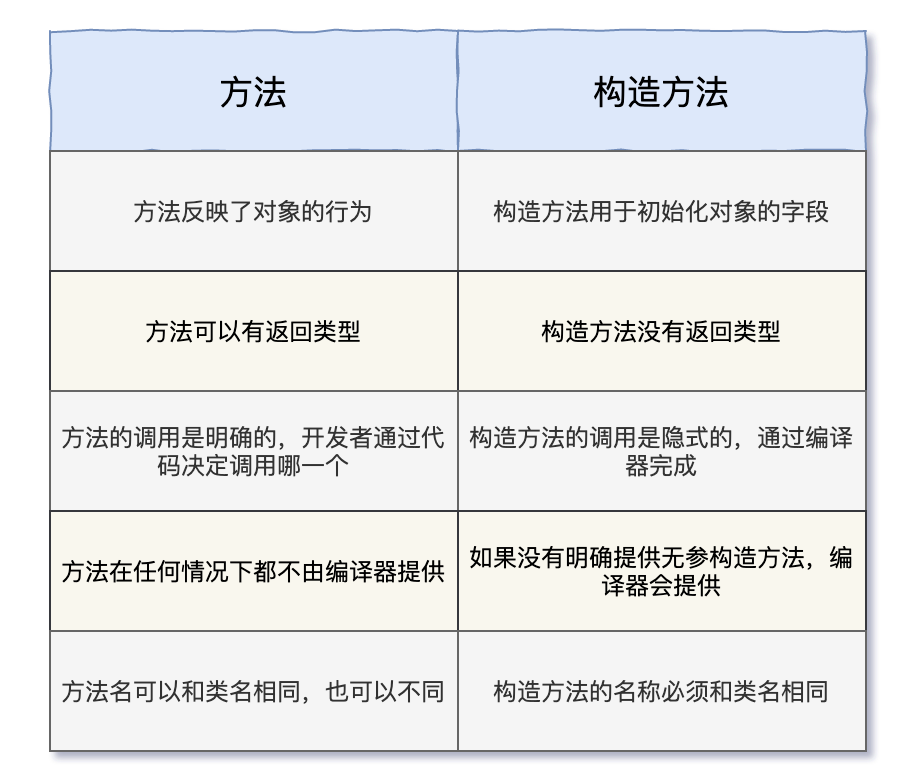 构造方法和方法之间的区别还是蛮多的,比如说下面这些:
