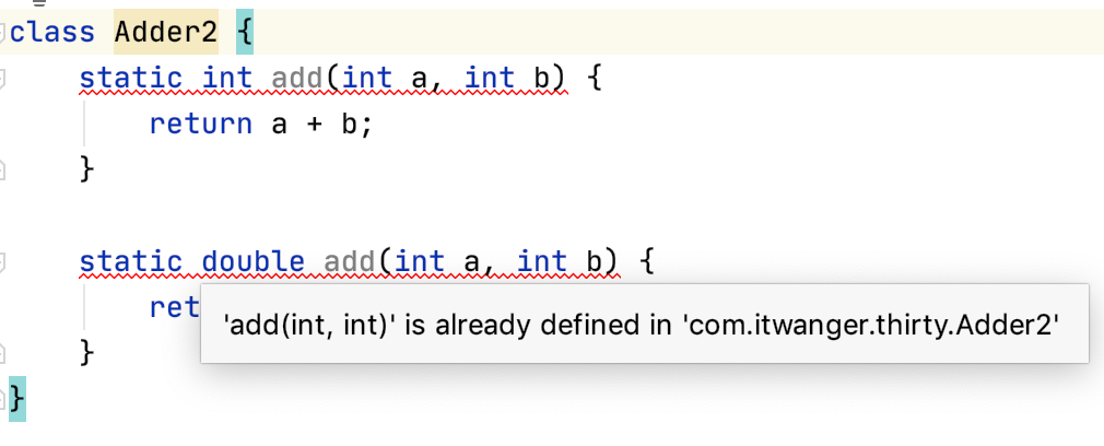 “Adder 类有两个方法,第一个 add() 方法的参数类型为 int,第二个 add() 方法的参数类型为 double。”
