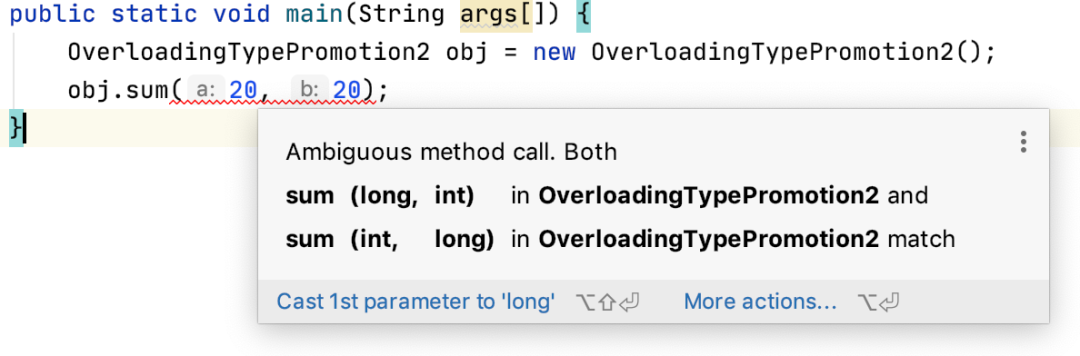 public class OverloadingTypePromotion2 { void sum(long a, int b) { System.out.println("long int"); } void sum(int a, long b) { System.out.println("int long"); } public static void main(String args[]) { OverloadingTypePromotion2 obj = new OverloadingTypePromotion2(); obj.sum(20, 20); }}