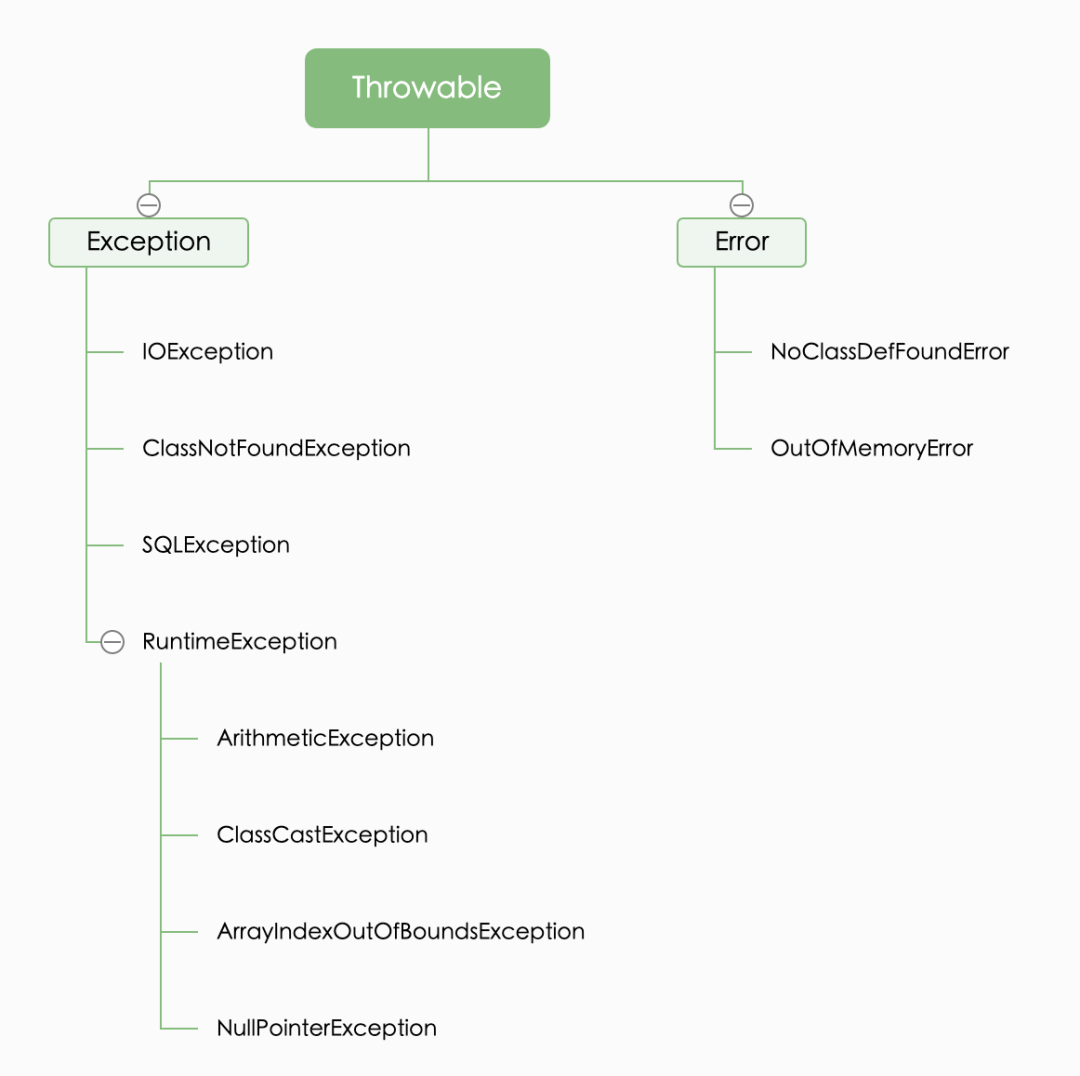 首先,Exception 和 Error 都继承了 Throwable 类。换句话说,只有 Throwable 类(或者子类)的对象才能使用 throw 关键字抛出,或者作为 catch 的参数类型。