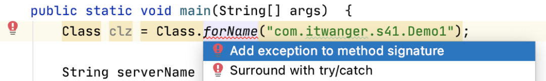 Class.forName() 方法在执行的时候可能会遇到 java.lang.ClassNotFoundException 异常,一个检查型异常,如果没有做处理,IDEA 就会提示你,要么在方法签名上声明,要么放在 try-catch 中。