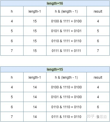2 的 N 次幂有助于减少碰撞的几率。如果 length 为2的幂次方,则 length-1 转化为二进制必定是11111……的形式,在与h的二进制与操作效率会非常的快,而且空间不浪费。我们来举个例子,看下图:
