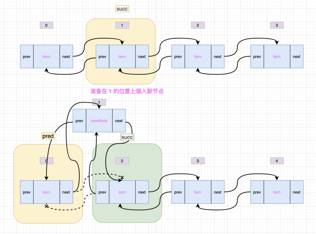 找到指定位置上的元素(succ)之后,就开始执行 linkBefore() 方法了,先将 succ 的前一个节点(prev)存放到临时变量 pred 中,然后生成新的 Node 节点(newNode),并将 succ 的前一个节点变更为 newNode,如果 pred 为 null,说明插入的是队头,所以 first 为新节点;否则将 pred 的后一个节点变更为 newNode。