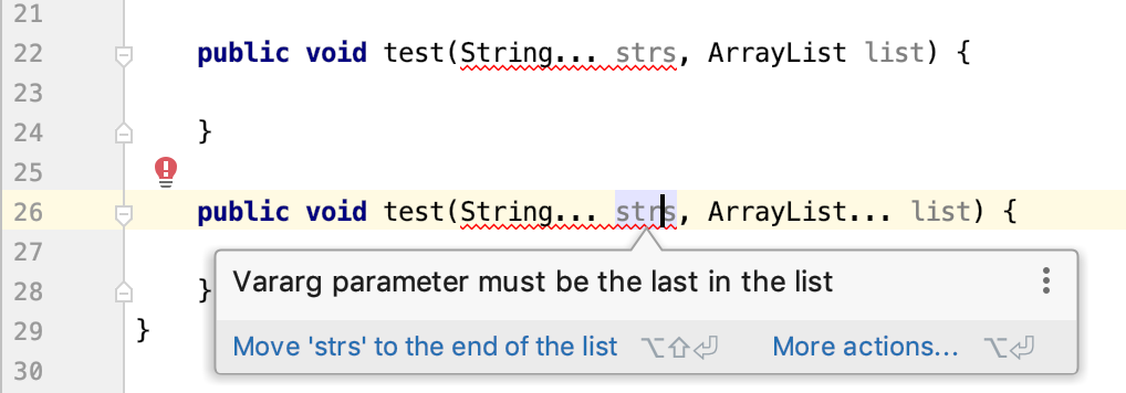 意思就是尽量不要使用可变参数,如果要用的话,可变参数必须要在参数列表的最后一位。既然坑位有限,只能在最后,那么可变参数就只能有一个(悠着点,悠着点)。如果可变参数不在最后一位,IDE 就会提示对应的错误,如下图所示。