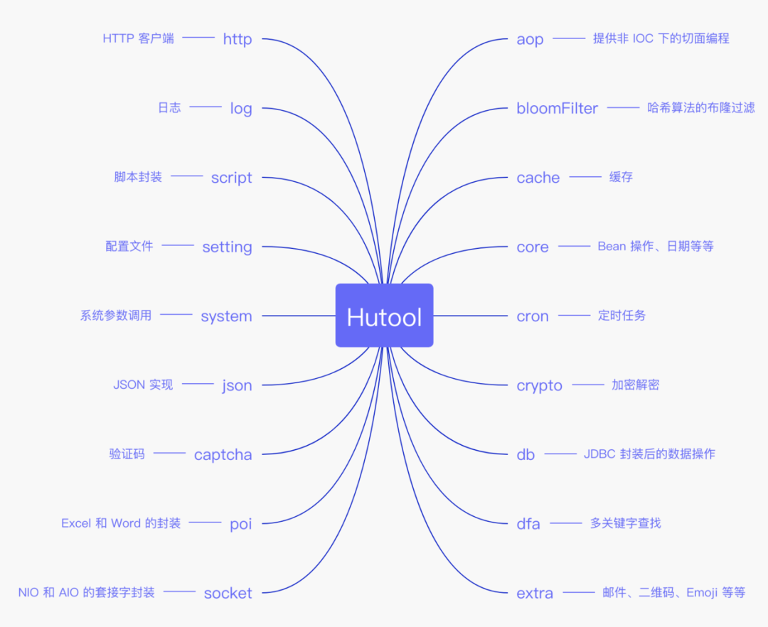 Hutool 对不仅对 JDK 底层的文件、流、加密解密、转码、正则、线程、XML等做了封装,还提供了以下这些组件: