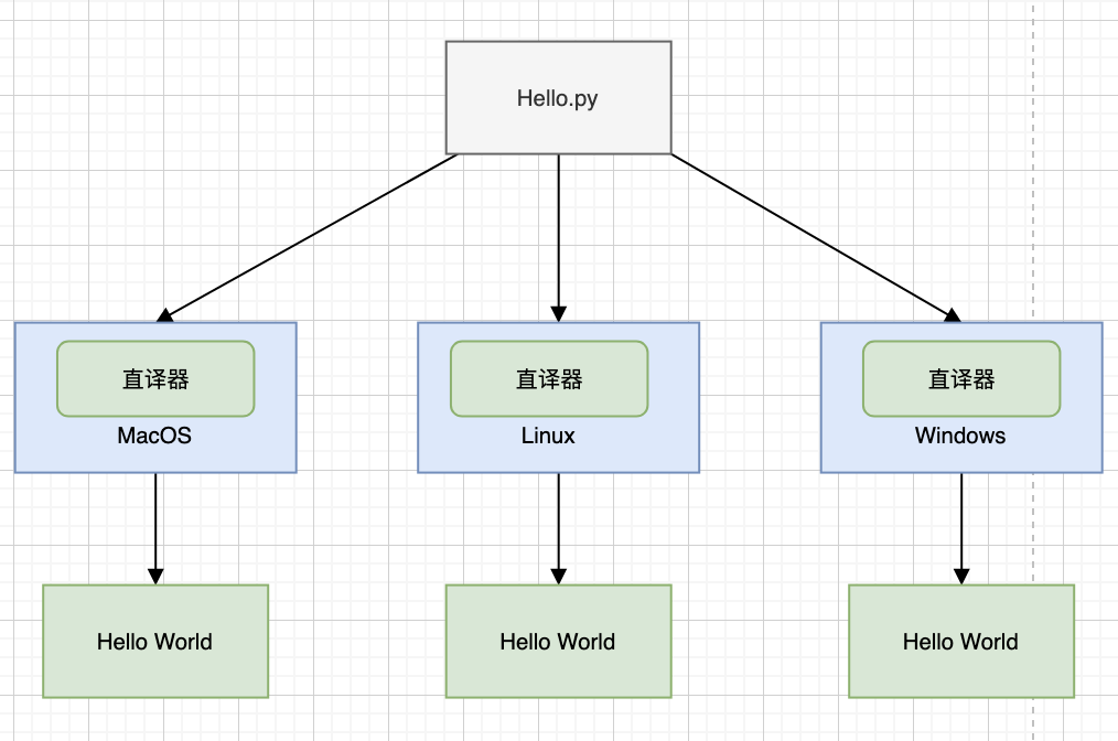 三妹不知道有没有听过直译器(解释器)这玩意?(估计你没听过)就是每跑一行代码就生成机器码,然后执行,比如说 Python 和 Ruby 用的就是直译器。在每个操作系统上装一个直译器就好了,跨平台的目的就达到了。