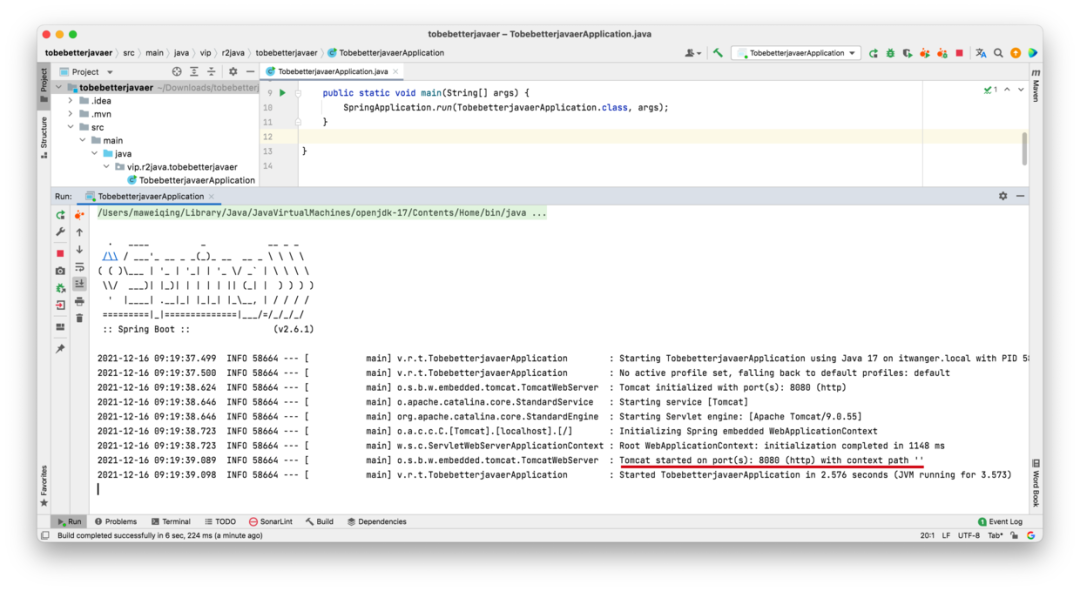 经过 2.5s 左右的 build 后,项目启动成功了,可以在日志中看到 Web 项目是以 Tomcat 为容器的,默认端口号为 8080,根路径为空。