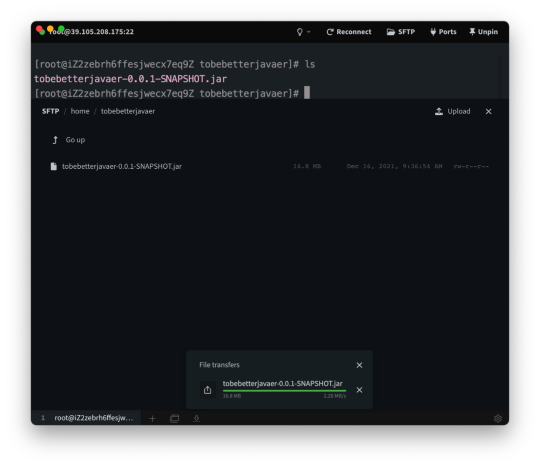 利用终端工具 Tabby,将 jar 包上传到服务器。
