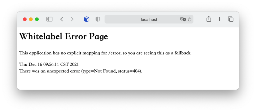 咦,竟然 Whitelabel 了,这个 404 页面是 Spring Boot 默认的错误页面,表示我们的请求在 Web 服务中不存在。