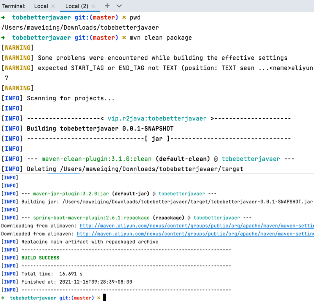 打开 Terminal 终端, 执行命令 mvn clean package,等待打包结果。