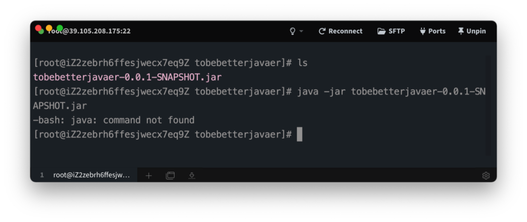 安装好 JDK 后,再次执行命令就可以看到 Spring Boot 项目可以正常在服务器上跑起来了。