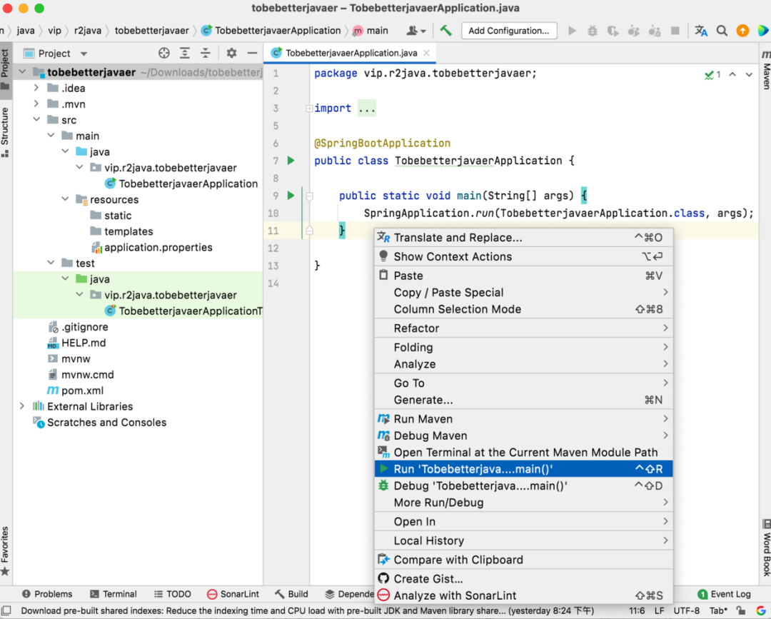 第一次启动,我个人习惯在 main 类中右键,在弹出的右键菜单这种选择「run ... main()」启动。