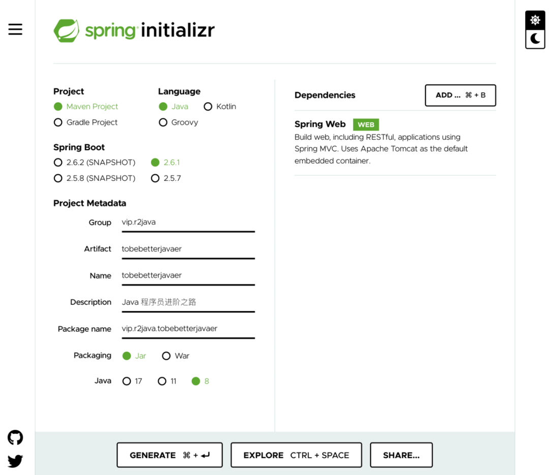 好,接下来我们使用 Spring Initializr 初始化一个 Web 项目,Project 选择 Maven,Spring Boot 选择 2.6.1,Java 选择 JDK 8,Dependencies 选择「Build web, including RESTful, applications using Spring MVC. Uses Apache Tomcat as the default embedded container.」