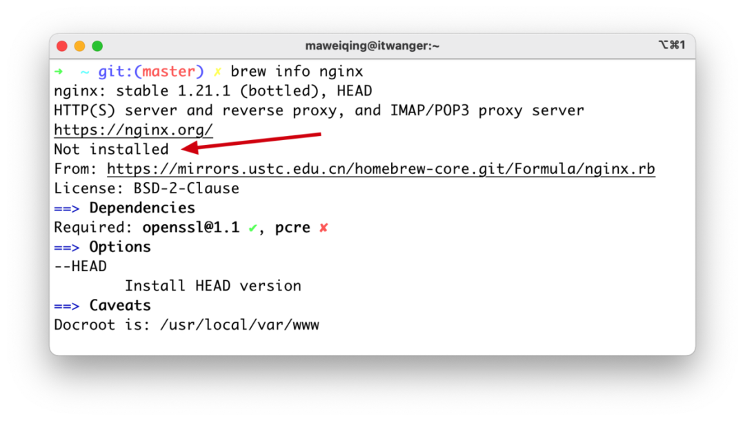 第一步,通过 brew info nginx 命令查看 Nginx 是否安装。