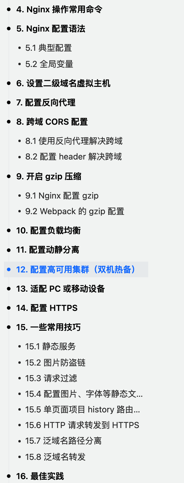 4)Nginx 从入门到实践,万字详解,图文版的,可以到掘金上看看这篇文章,内容基本上面面俱到了(可以看一下下面的目录),配合前面的视频课,拿下 Nginx 基本上是稳了。