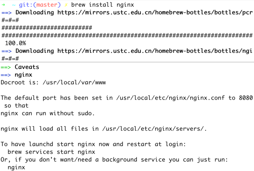 第二步,通过 brew install nginx 命令安装 Nginx。