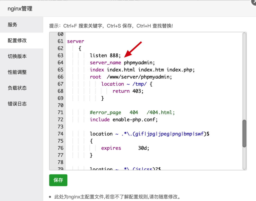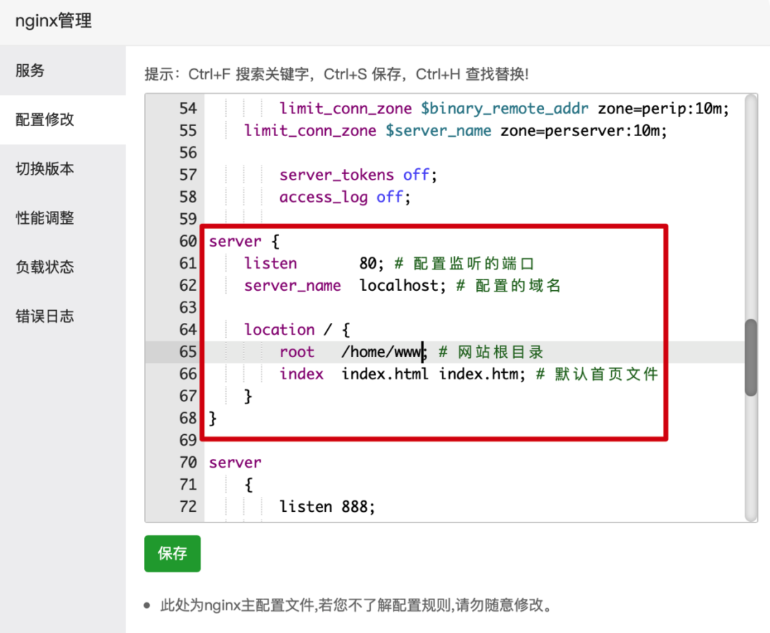 好,现在我们登录宝塔面板,尝试把默认的 server 配置复制到 Linux 服务器中的 Nginx 配置里。