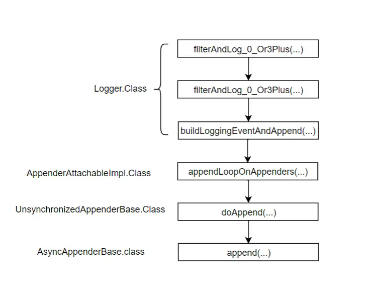 从 logback框架下的 Logger.info方法开始追踪。一路的方法调用路径如下图所示: