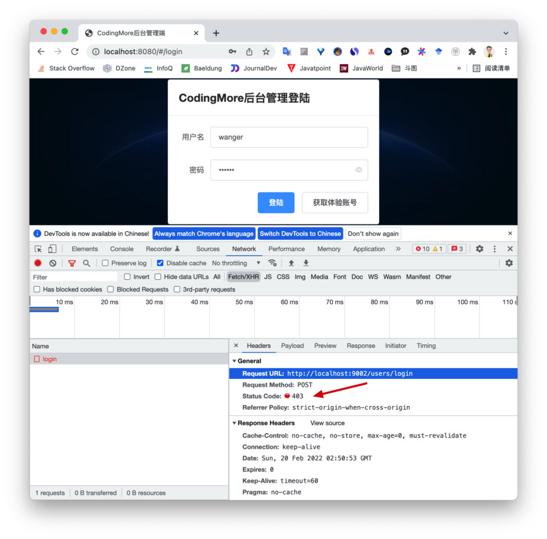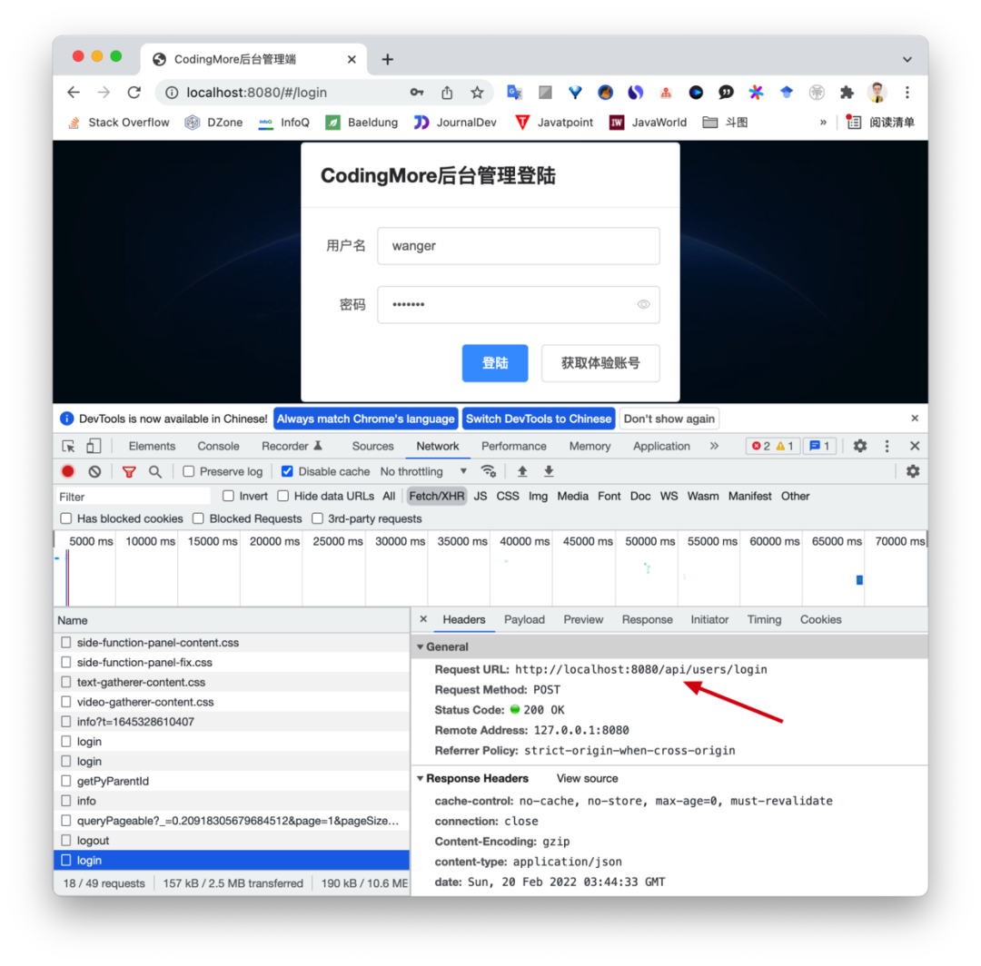 第二步,重启后端服务,再次点击登录按钮,发现请求已经可以正常访问了。