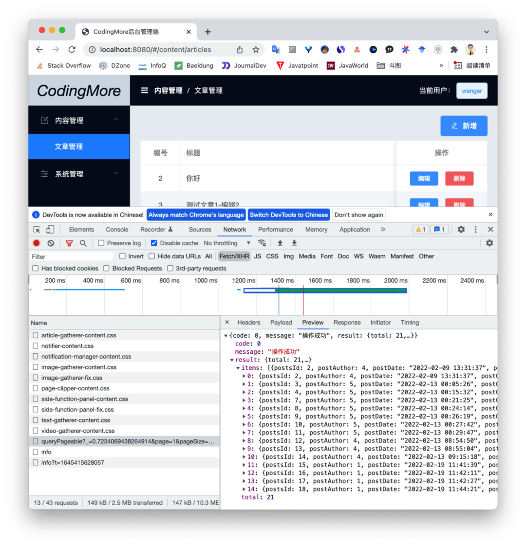 拿编程猫的文章管理页来举例,该页面会向后端发起一个 posts/queryPageable 的分页查询,该请求包含了一个自定义的消息头 Authorization,于是浏览器认为该请求是一个非简单请求,然后就会自动发起一次 OPTIONS 请求,但由于我们的 Spring Boot 项目整合了 SpringsScurity 安全管理框架,没有对OPTIONS请求放开登录认证,导致验证失败,文章分页请求的响应数据就没有返回回来。