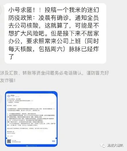 紧接着,就有大V爆料,疫情发生后,小米公司根据疫情防控统一要求,员工核酸之后可以正常上/下班,引起热议。