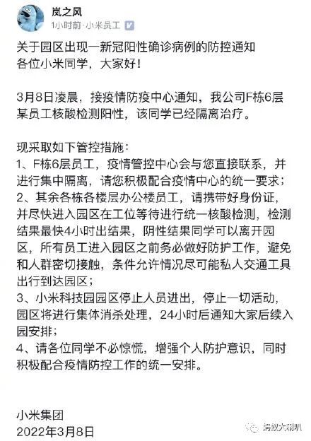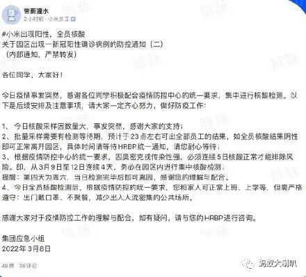 据小米员工爆料,3月8日凌晨,接疫情防疫中心通知,小米科技园F栋6层某员工核酸检测阳性,现已隔离。