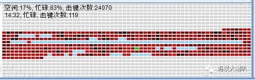 为了满足这个要求,在新版本增加了一个一天的电脑使用统计表,如图中所是,每一个小格代表的是一分钟,管理者可以在自己的电脑上清楚的看到员工在几点几分的工作状态。当鼠标经过每一小格时,可以显示这一分钟状态(忙碌或者空闲)和键盘敲击次数。