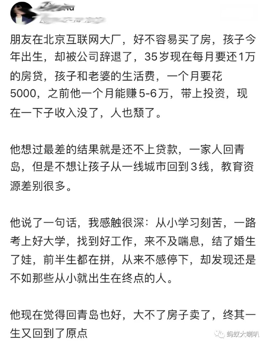 现在即使是那些大厂技术骨干(年薪五十万以上),今年很多也是叫苦连连...,甚至不得不卖房求生,回归老家生活。