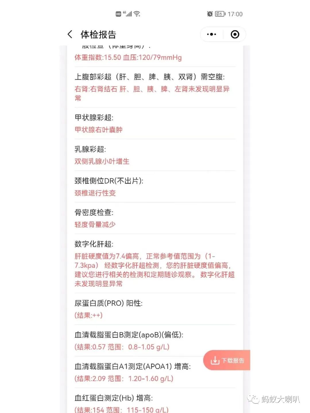 体检显示:肾结石,颈椎增生,甲状腺结节,尿蛋白2个+,肝硬度高,缺钙…。