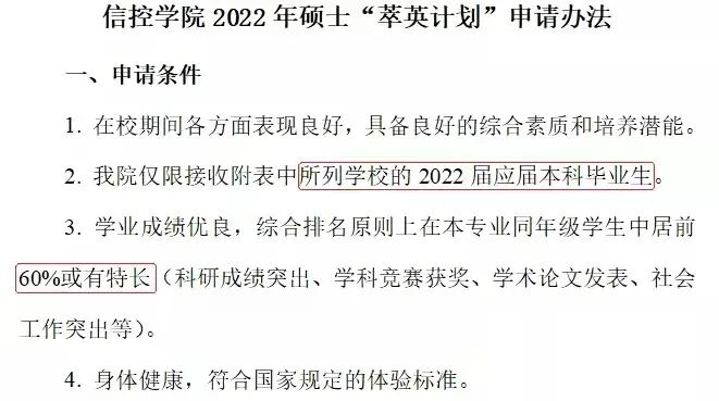 西安建筑科技大学的“萃英计划”每个学院的申请办法由各学院制定,以信息与控制工程为例,其申请条件主要为: