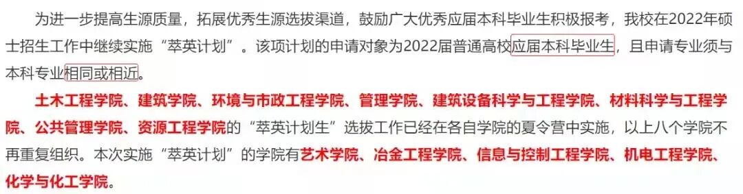 西安建筑科技大学也为提高生源质量,拓展优秀生源选拔渠道,在2022年硕士招生工作中继续实施“萃英计划”。该项计划的申请对象为2022届普通高校应届本科毕业生,且申请专业须为本科专业相同或相近,共有八个学院,申请时间为2021年9月1日-2021年9月30日!