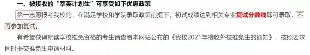 除上述三所院校的相应计划政策外,对复试有利的还有例如像一些院校举办的夏令营,通常获得“优秀营员”等称号的在推免和复试中都有优势,只要可以通过复试线,录取的概率就极大。除此之外,还有部分院校的等额复试,也对复试有利,例如2021年辽宁大学的部分专业就采取了等额复试(1:1),还有部分上线人数小于招考人数的专业,录取概率也会更高一些!