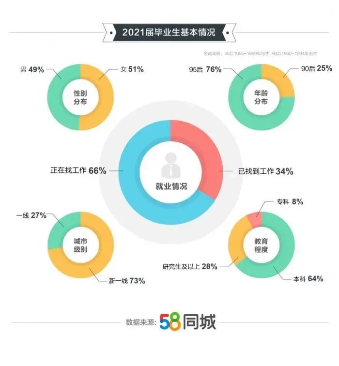 以2021年高校毕业生就业情况为例,58同城招聘平台统计,本科学历占总就业生的比为64%,研究生及以上学历占比为28%,其他为专科学历。