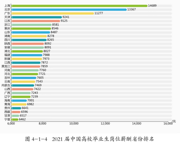 根据2021届中国高校毕业生岗位薪酬省份排名来看,上海以14689元的薪酬超过北京,领跑全国;北京毕业生岗位薪酬以13367元紧随其后;广东毕业生薪酬以11277元位列第三。