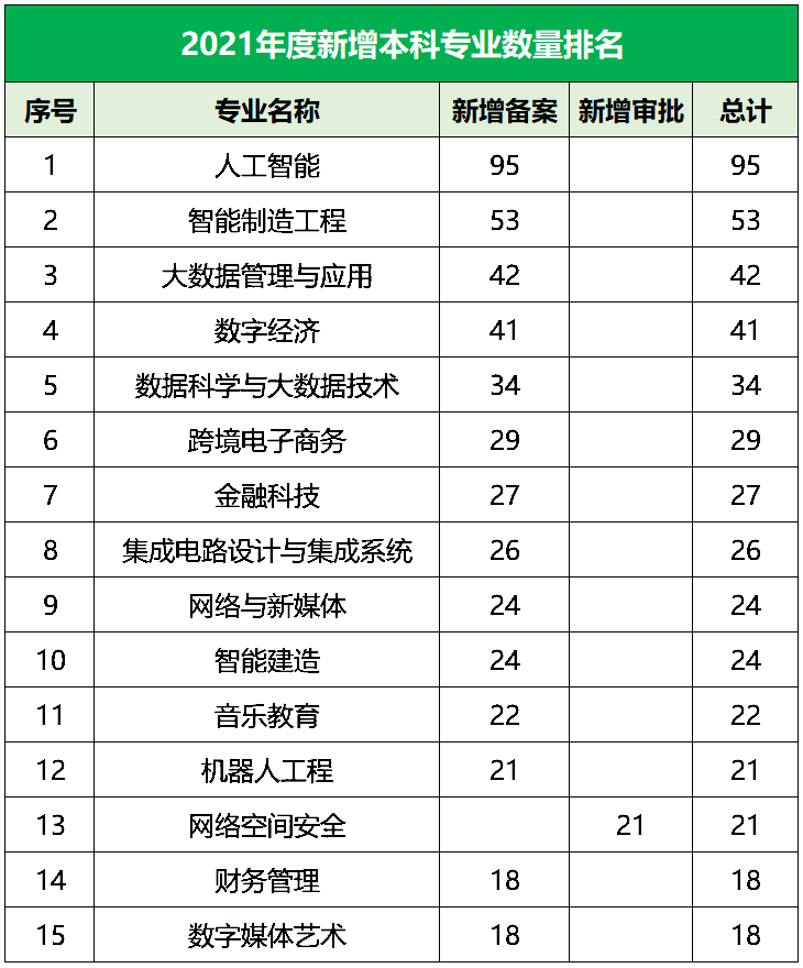综合来看2021年度新增备案和新增审批的1961个专业,可以发现目前社会上最热的人工智能、智能制造工程、大数据类的专业新增最多,新增的专业基本都是目前社会上最为稀缺的那一部分,而且都与最新技术、高科技类相关。