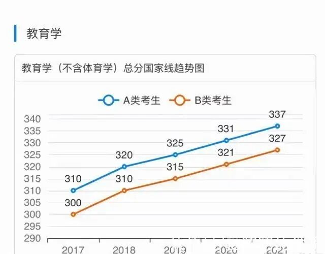 就得参考2021考研国家线来看了,以教育学2021的国家线为例,A类考生的国家线是337分,B类考生是327分,有着10分之差。