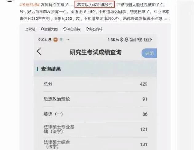 这位考生以为政治是满分的,结果是91分,对专业课的估分是280分左右,没想到出来是250分,在400分以上高分的考生中,也是尖子类的考生。