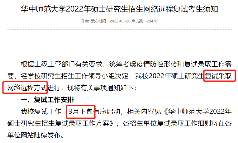 华中师范大学明确复试工作采取网络远程方式,复试时间将会在3月下旬有序启动。