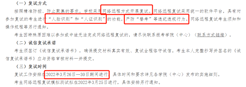 网络远程复试采用统一的软件平台,具有对参加复试的考生进行“人脸识别”和“人证识别”的功能,严防“替考”等违纪违规行为。