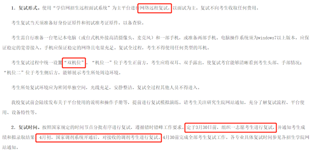3月30日前,组织一志愿考生进行复试。4月初,国家调剂系统开通后,对接收的调剂考生进行复试。