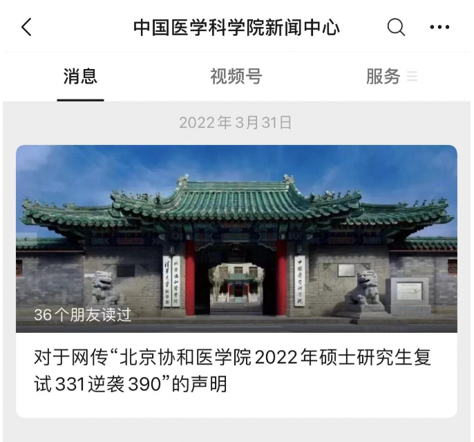 针对网传“北京协和医学院2022年硕士研究生复试331逆袭390”相关言论,3月31日晚,北京协和医学院研究生招生处发布了对于网传“北京协和医学院2022年硕士研究生复试331逆袭390”的声明。