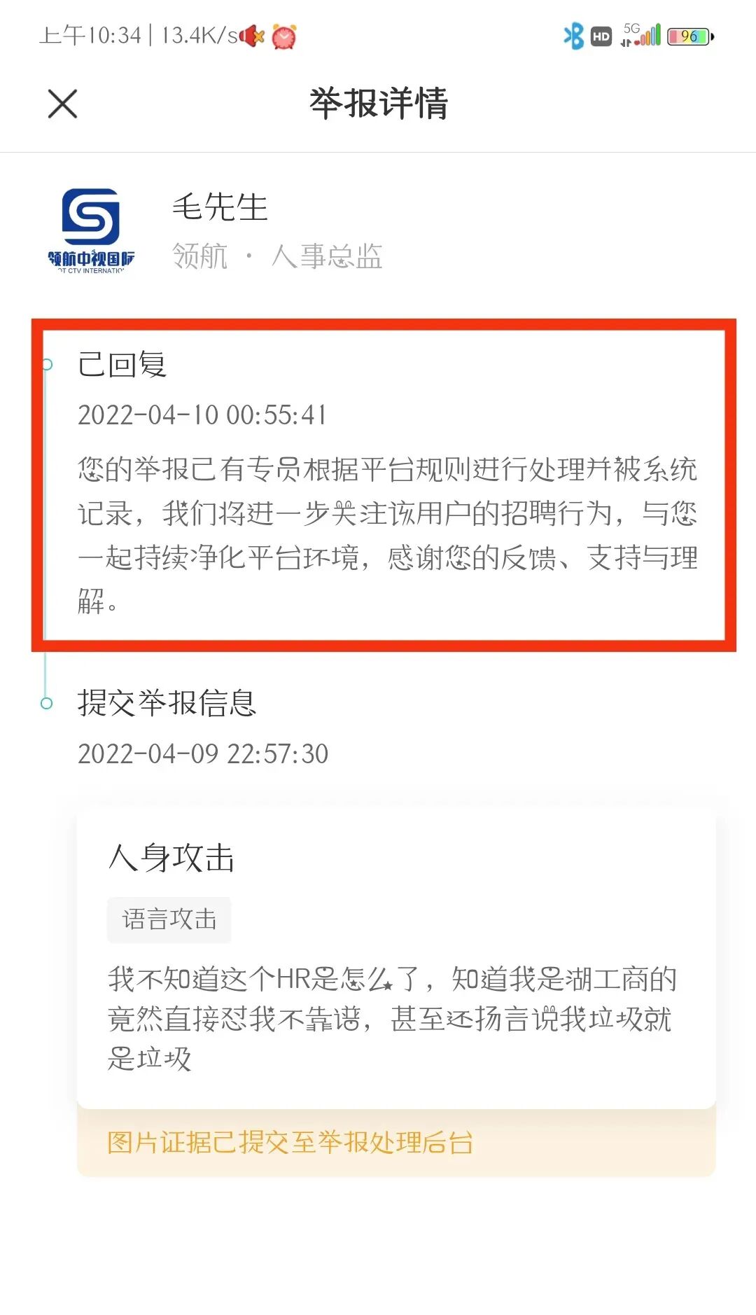 事情发生后,黄同学在BOSS直聘平台进行投诉举报。现平台方已致歉并关停该HR岗位。