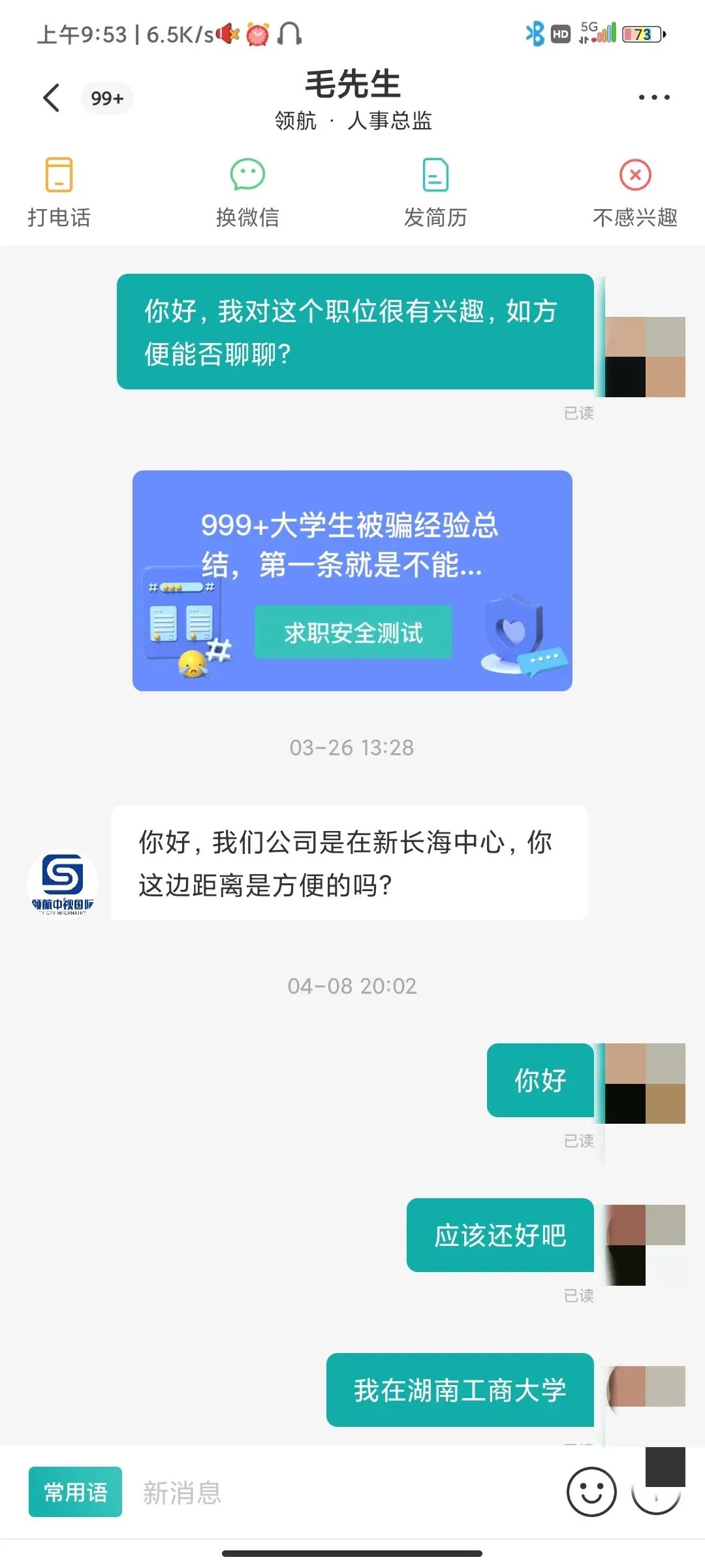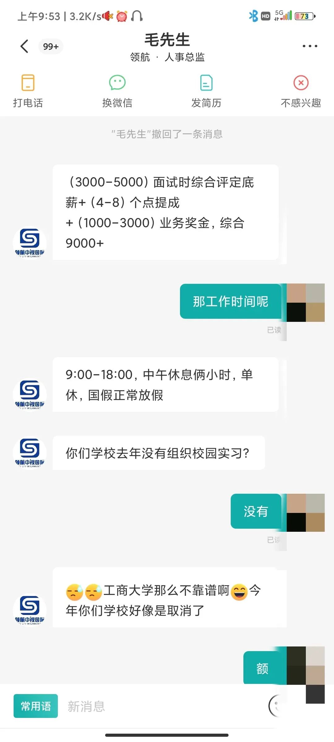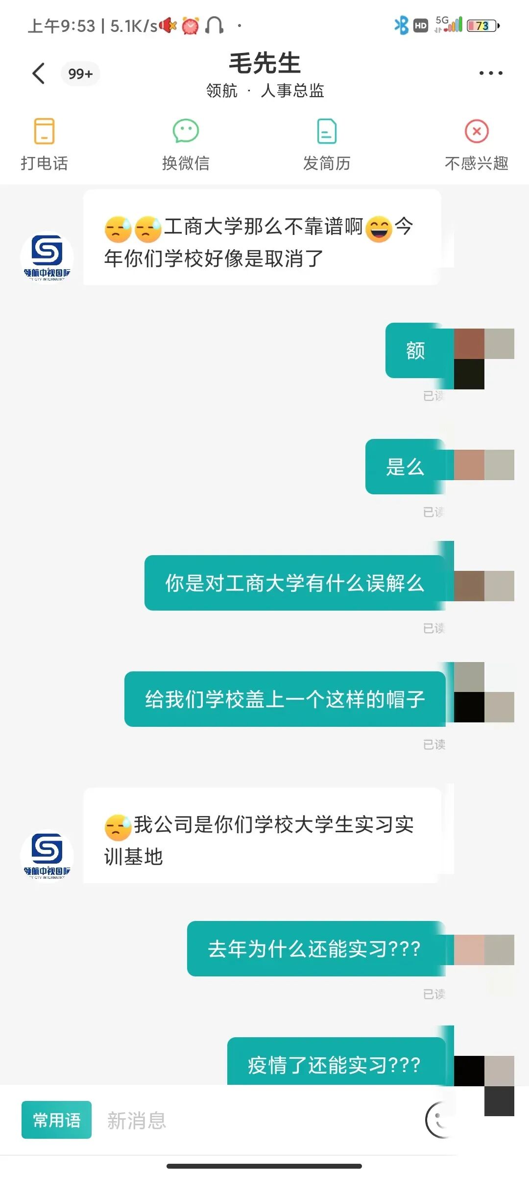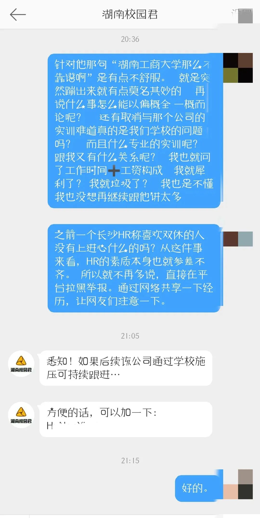 据此前报道,黄同学提供的微信聊天记录截图显示,HR在了解黄同学所在的学校是“湖南工商大学”后,认为黄同学所在的学校“不靠谱”,并称自己公司就是黄同学学校的实习实训基地。