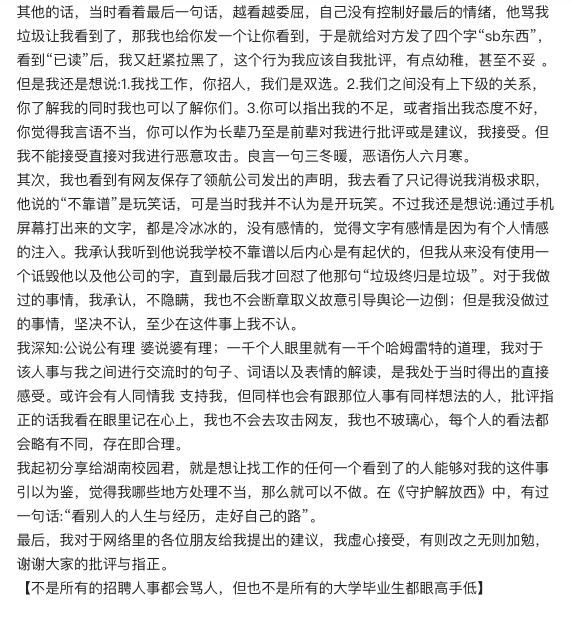 近日,湖南工商大学的黄同学(化姓)线上求职遭HR吐槽学校不靠谱,还被骂“垃圾就是垃圾”。12日上午,当事人黄同学在社交平台发文称,不是所有的招聘人事都会骂人,但也不是所有的大学毕业生都眼高手低。